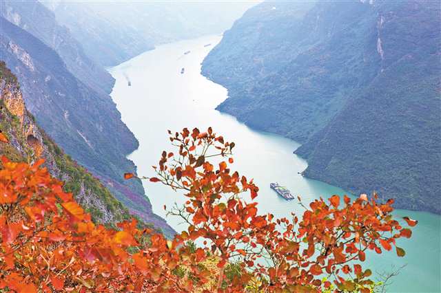 11月22日,船只航行在红叶映衬下的长江三峡巫峡段。第十九届重庆长江三峡(巫山)国际红叶节于当晚开幕,巫山120万亩红叶进入最佳观赏期。