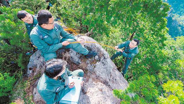 雪宝山国家级自然保护区工作人员正在进行崖柏科研调查。