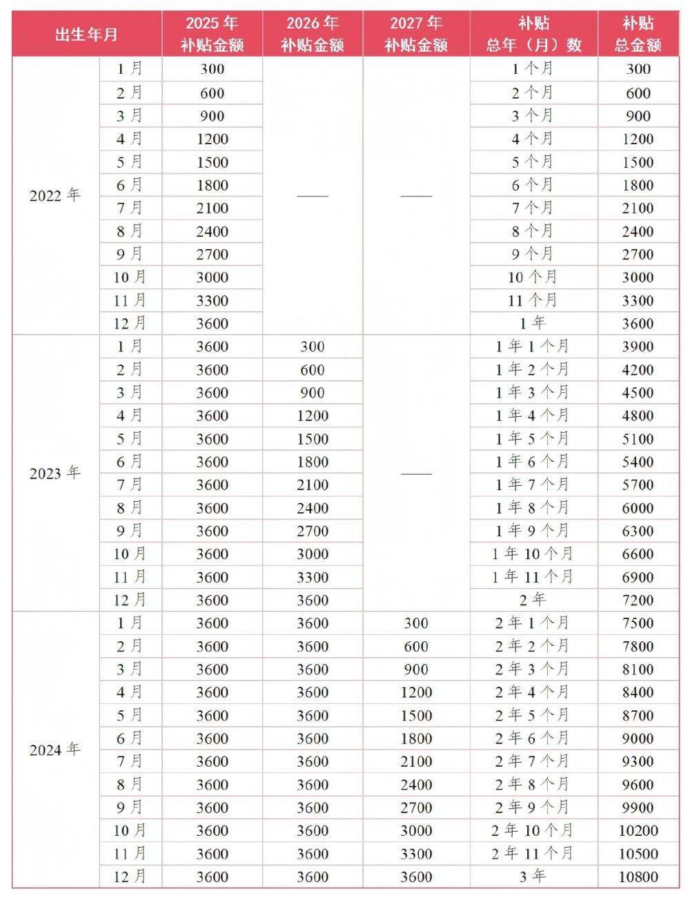 对2025年1月1日及之后出生的婴幼儿,补贴发放至其年满3周岁止。对2025年1月1日之前出生、不满3周岁的婴幼儿,按其未满3周岁的剩余月份数折算计发补贴。具体算法见表: