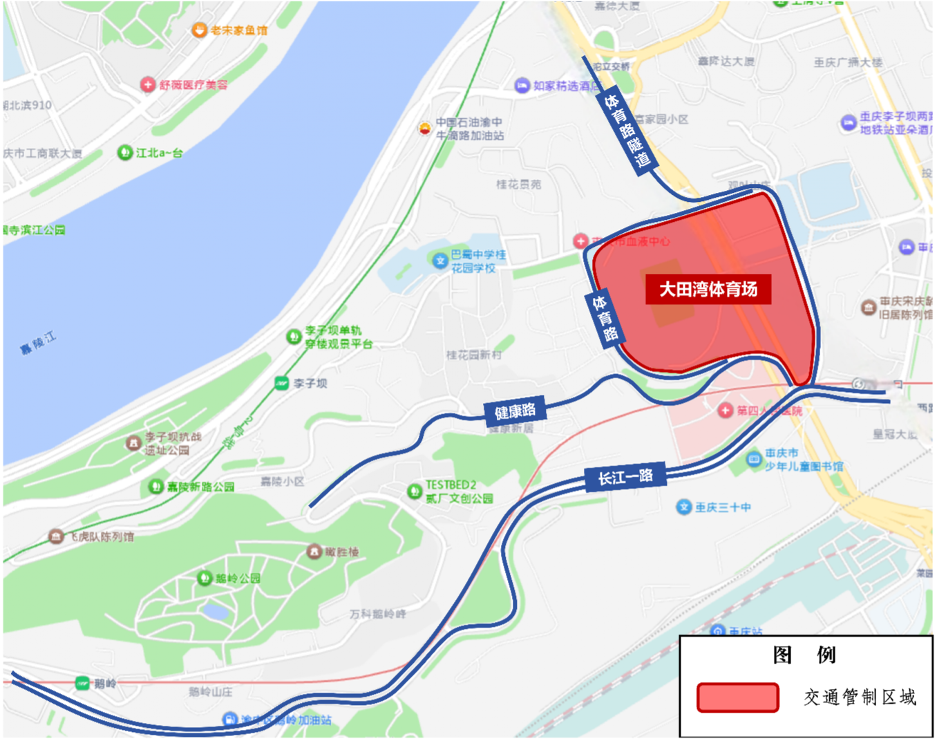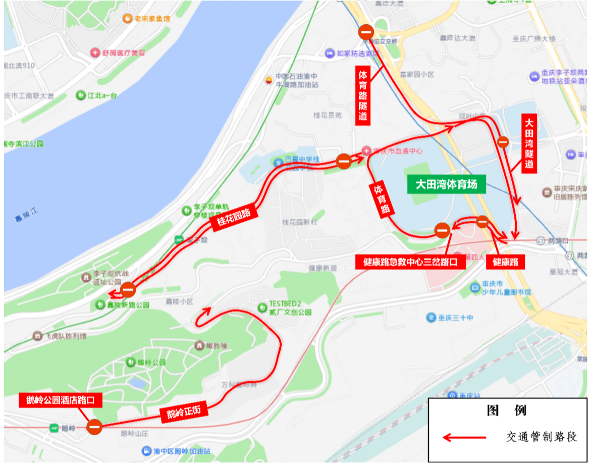 12月12日,记者从重庆市公安局渝中区分局获悉,“新韵重庆 渝超同行”2025重庆城市足球超级联赛期间,重庆市渝中区大田湾体育场计划将于12月14日举办赛事。为维护体育场周边道路交通安全、有序,确保活动顺利进行,重庆市公安局渝中区分局届时将对体育场周边部分区域和道路实施交通管制。