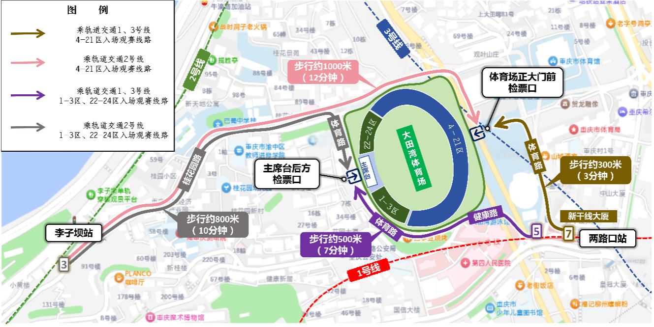 方案2:乘2号线李子坝站→3号口出站→步行约800米(10分钟)→桂花园路→体育路→主席台后方检票口。
