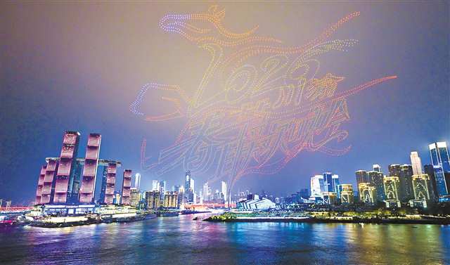 1月24日,“新韵重庆”无人机灯光秀,无人机排列出2026川渝春节联欢晚会主题图案。记者 张锦辉 摄\视觉重庆