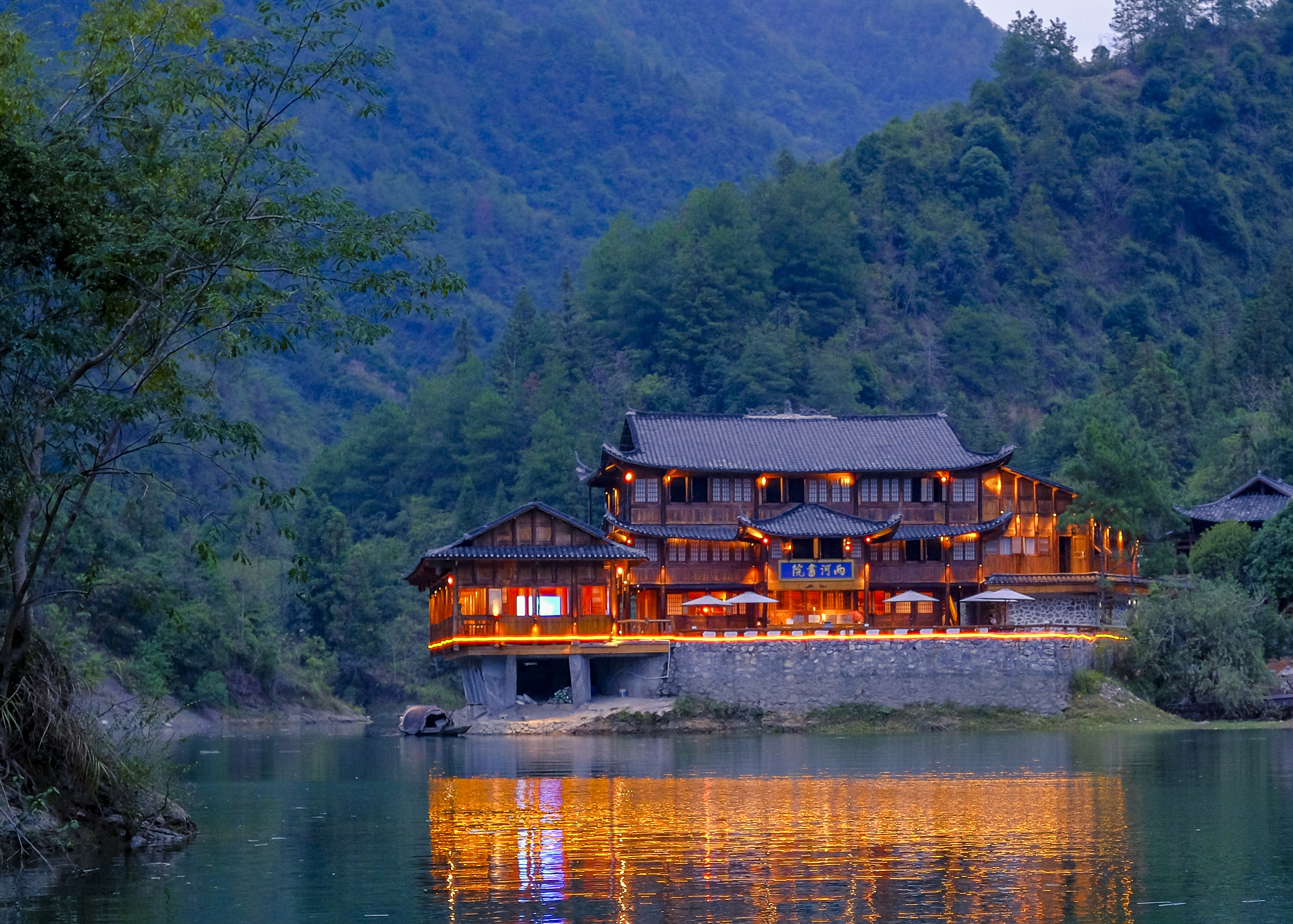 密基卡民宿地处酉阳,它复刻了当地土家族传统吊脚楼样式,由数十位土家族老工匠历时7年时间精心打造而成。其中,“三面悬空吊脚楼建筑技艺”将土家吊脚楼“屹立悬崖边,融于山水间”的建筑智慧展现得淋漓尽致,充分彰显了土家风情。