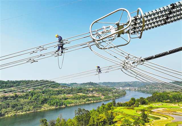 合川区沙鱼镇,哈密—重庆±800千伏特高压直流输电工程,运检员工开展走线验收。(资料图片)记者 张锦辉 摄/视觉重庆