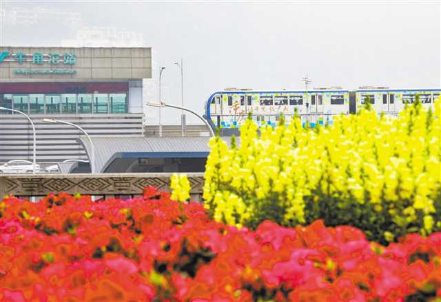 1月11日,从渝中区嘉陵江大桥南桥头眺望,黄色的金鱼草、红色的杜鹃与轨道牛角沱车站一侧行驶的轨道列车同框,让人们仿佛感受到春天的气息。这一美景吸引了不少赏花者和摄影爱好者纷至沓来。记者 张锦辉 摄/视觉重庆