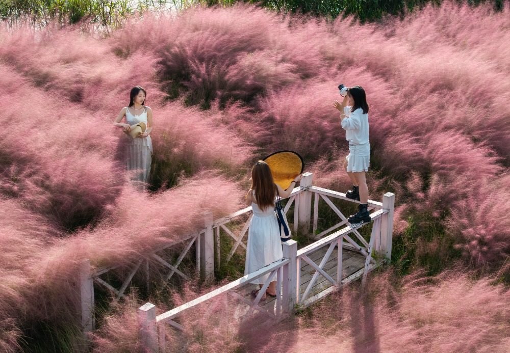10月7日,南川区黎香湖镇湿地生态园,粉黛乱子草烂漫盛放,吸引不少游客前来打卡游玩,尽享秋日浪漫。特约摄影 罗川