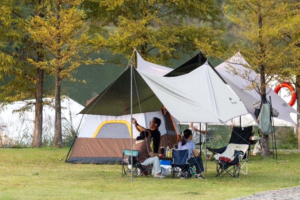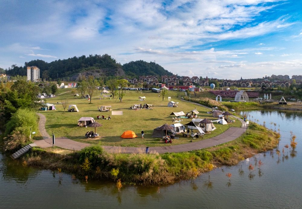 秋日的黎香湖镇湿地生态园内,粉黛乱子草迎来盛花期,大片粉红色的花海如梦如幻,成为游客们拍照留念的打卡胜地。露营区大片的绿色草坪上,各式帐篷星罗棋布,游客们在此享受大自然的宁静与惬意。