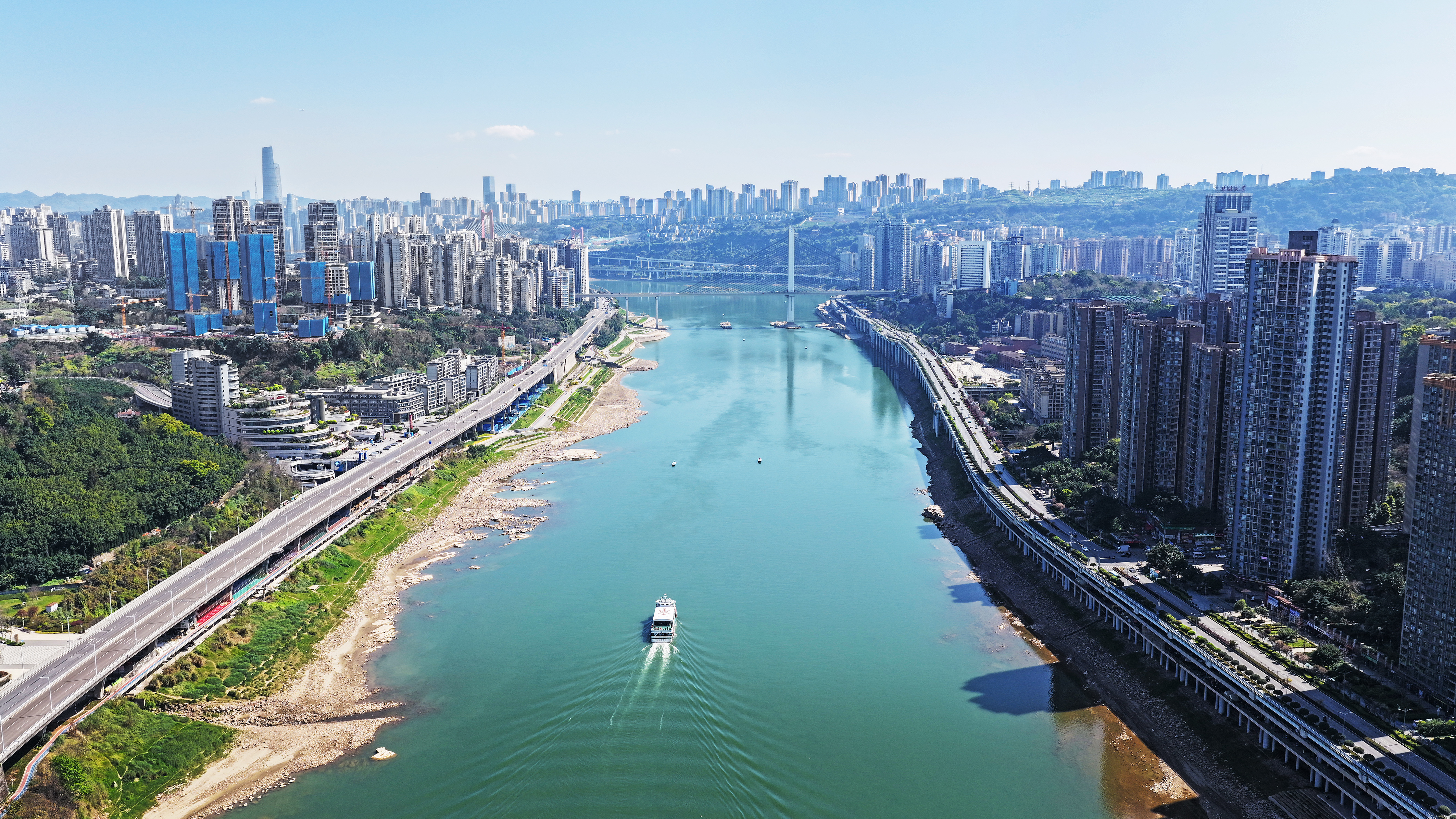 3月10日,南滨路,长江春水宛若一条蜿蜒曲折的蓝色飘带,串起两岸城市美景(无人机照片)。特约摄影 钟志兵