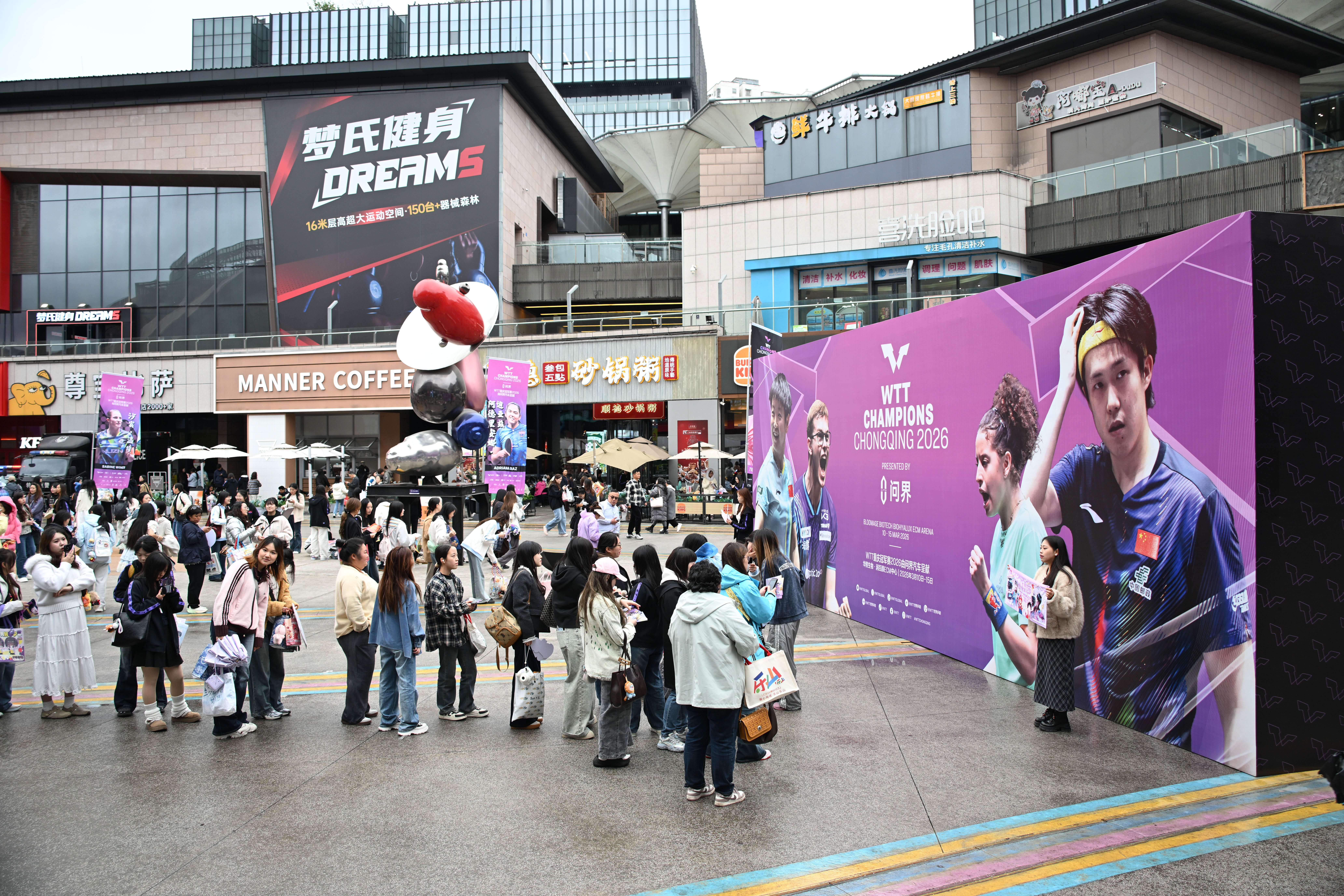 2026年3月14日,重庆巴南华熙生物·润百颜ECM中心,球迷排队自拍。记者 谢智强 摄