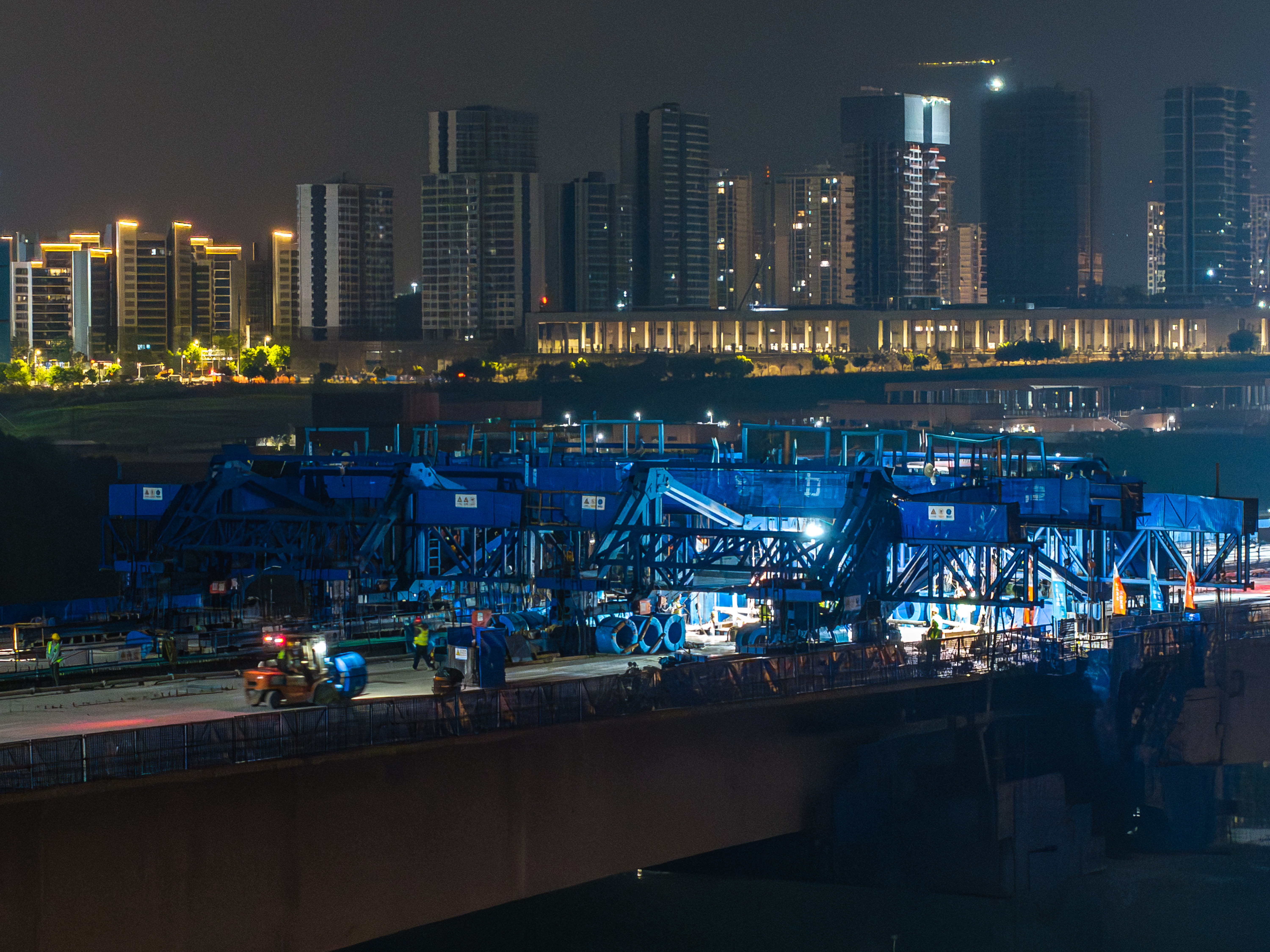 4月8日,宝山嘉陵江大桥施工现场,工人在操作叉车进行作业(无人机照片)。记者 李雨恒 摄