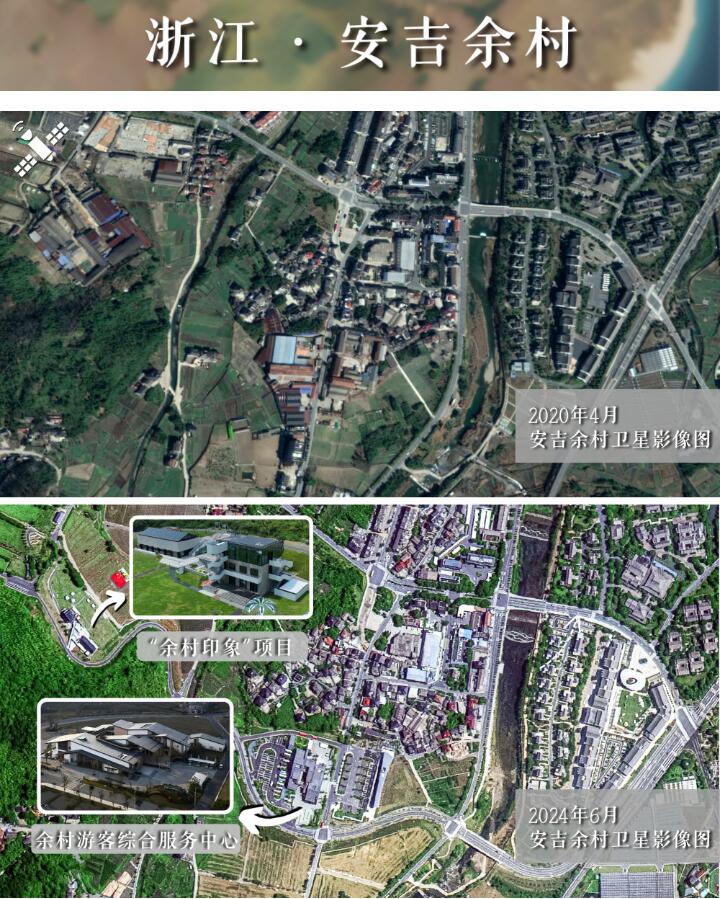 解读:2020年4月原貌(上图)对比2024年6月新貌(下图),安吉余村将废弃厂房改造为“余村印象”项目,并建成余村游客综合服务中心。