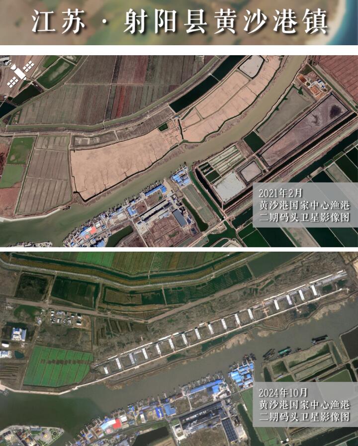 解读:2021年2月施工初期(上图)对比2024年10月(下图),黄沙港国家中心渔港二期工程码头主体已建成。