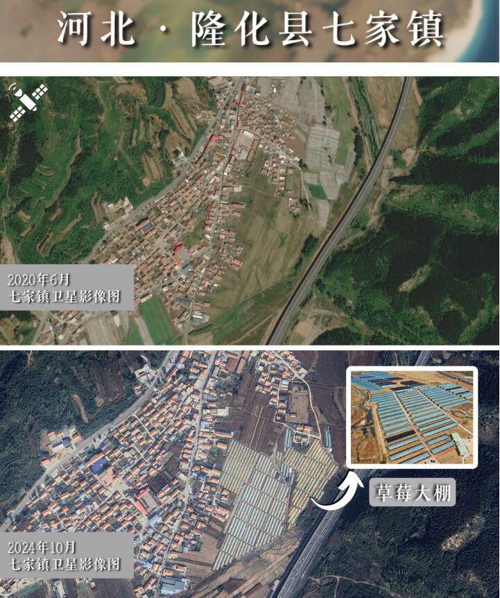 2024年10月的隆化草莓谷卫星影像图中可见连片草莓大棚群。