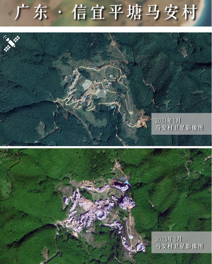 解读:2021年1月村落原貌(上图)对比2023年2月新貌(下图),马安村文旅建筑群规模显现。