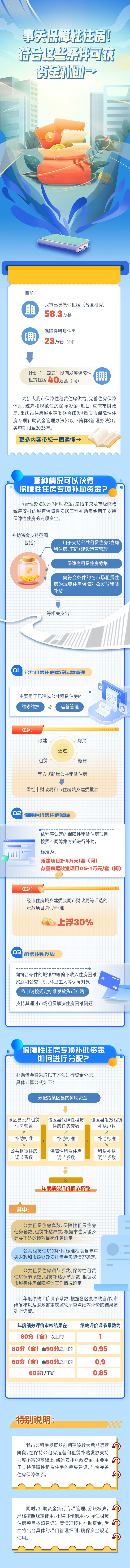 为扩大重庆市保障性租赁住房供给、完善住房保障体系、统筹和规范住房保障资金,近日,重庆市财政局、重庆市住房城乡建委联合印发《重庆市保障性住房专项补助资金管理办法》(以下简称《管理办法》),实施期限至2025年。更多内容一图读懂。