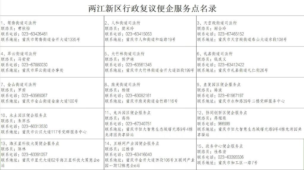 记者从两江新区司法局获悉,两江新区首批15个“行政复议便企服务点”正式挂牌成立,让企业和群众在“家门口”,就能享受“一站式”的行政复议服务。