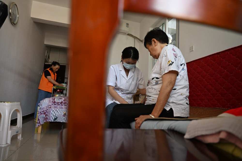 6月16日,璧山区璧城街道杨柳坝社区香江嘉园小区,工作人员在老人家中为老人提供清洁、体检服务。记者 崔力 摄/视觉重庆