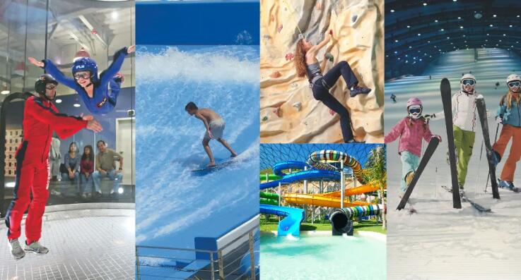 在这里,已经形成以室内跳伞、室内滑雪、室内冲浪、室内攀岩四大王牌项目为核心,涵盖大众娱雪、蹦床、高空滑翔、射箭、拓展运动等众多运动类型的复合式、立体化项目体系。