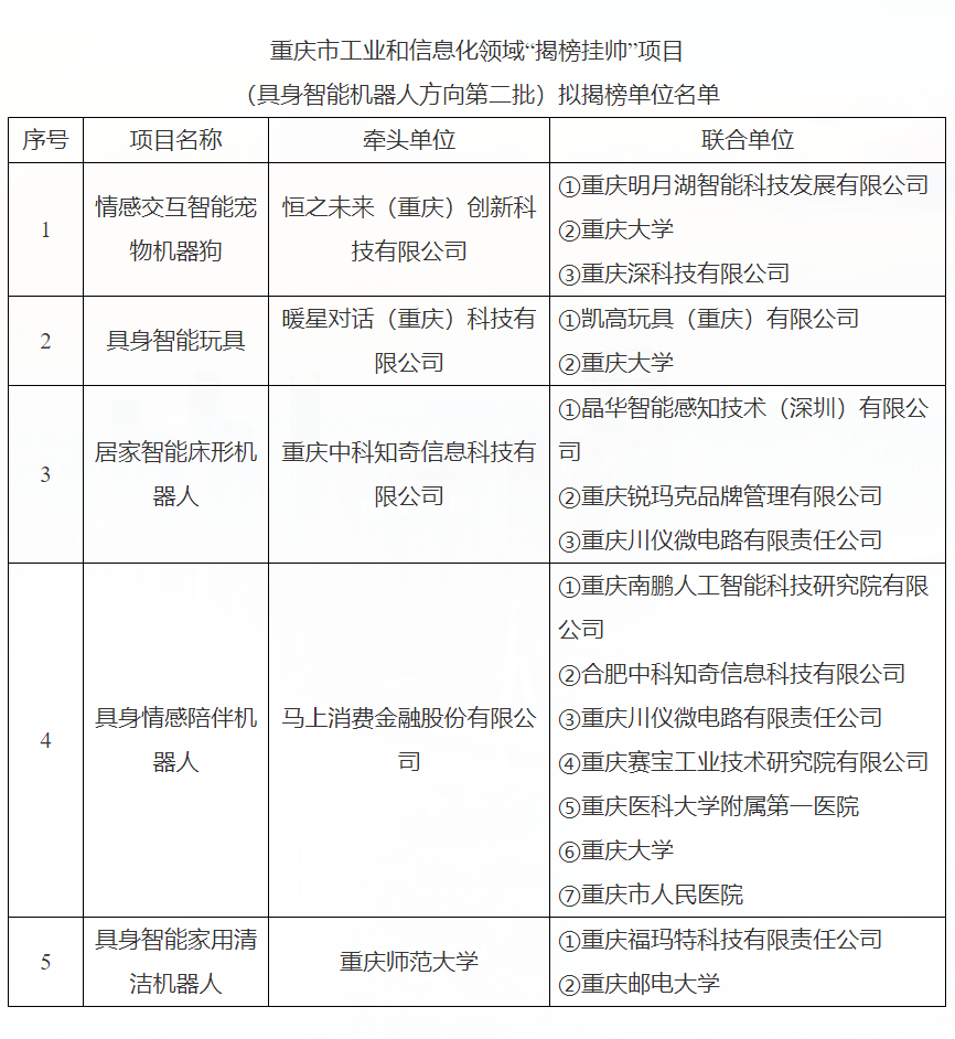 市经济信息委表示,此次公示的5类具身智能产品,部分已经在市场投用并反馈良好。比如由马上消费金融股份有限公司作为牵头单位,联合重庆大学、重庆市人民医院等多个单位共同开发的“具身情感陪伴机器人”,此前入驻重庆市第一社会福利院,深受不少老年人喜爱。