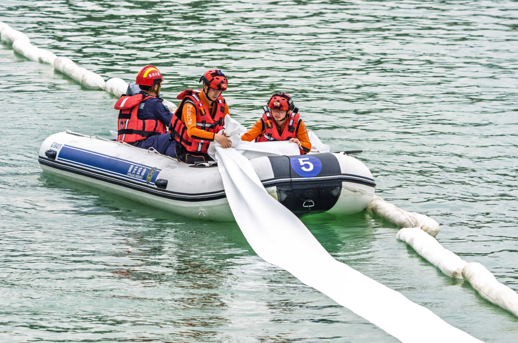 应急队伍在布设围油栏。记者 李雨恒 摄