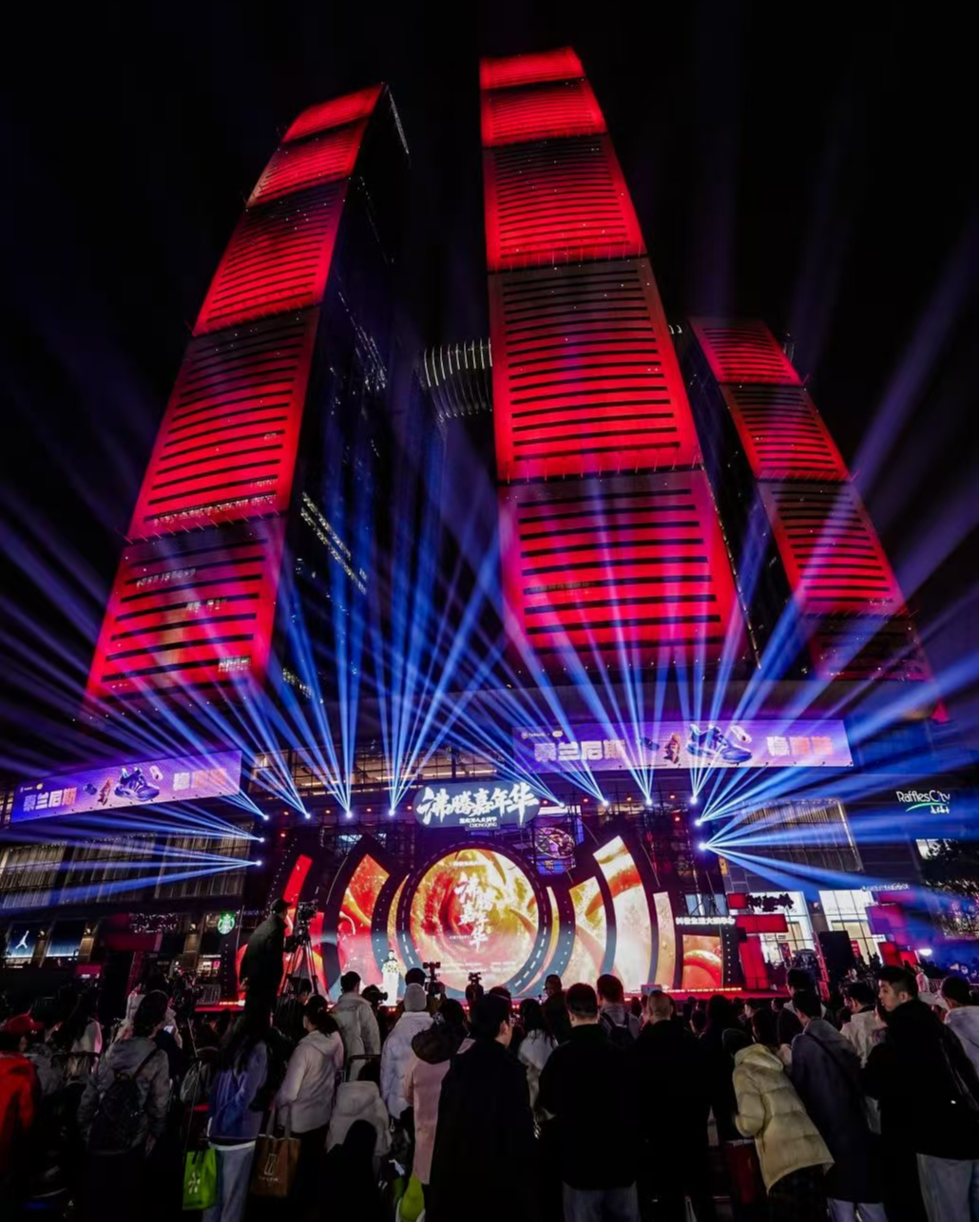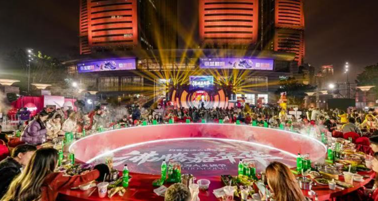 晚宴区域,巨型环形火锅桌陈列于朝天门广场中央,嘉宾与市民围坐共享热气腾腾的火锅。穿插其间的脱口秀与文艺演出,进一步升华了火锅的社交与文化内涵。与此同时,抖音平台全程直播,让数百万网友同步“云开席”,共享山城热情。