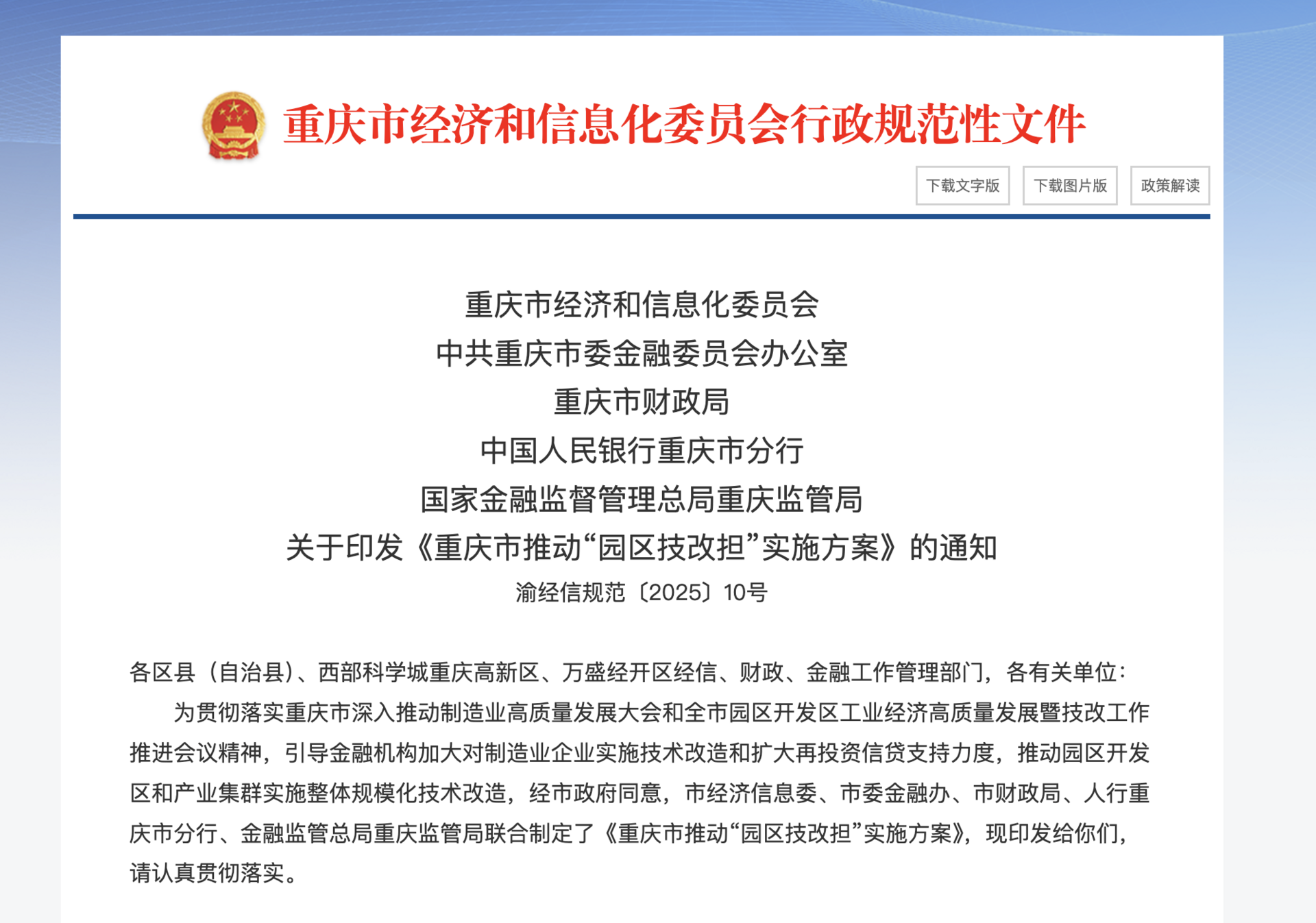 日前,重庆市经济和信息化委员会、中共重庆市委金融委员会办公室、重庆市财政局、中国人民银行重庆市分行、国家金融监督管理总局重庆监管局联合发布《重庆市推动“园区技改担”实施方案》(以下简称《方案》)。