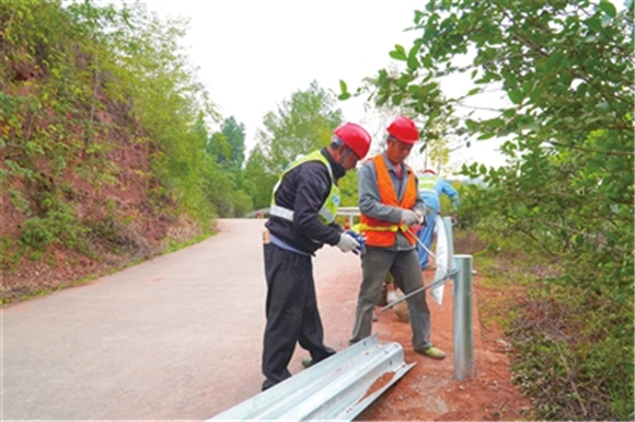 聚奎镇爱和村十一组,工人在安装农村公路防护栏。记者 谢清城 摄
