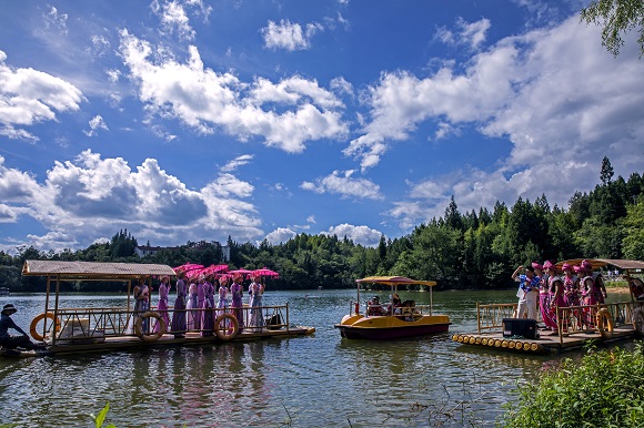 同时,石柱县还在度假区内策划实施文化遗产日暨非遗购物节、非遗传承大讲堂等系列活动,组织土家啰儿调、玩牛、土家斗锣、石柱板凳龙等30余个非遗代表性项目开展“三进”活动;建成黄水游客中心非遗超市,布置黄水旅游度假区非遗店铺20家,为游客打造全场景“非遗”文化“盛宴”。