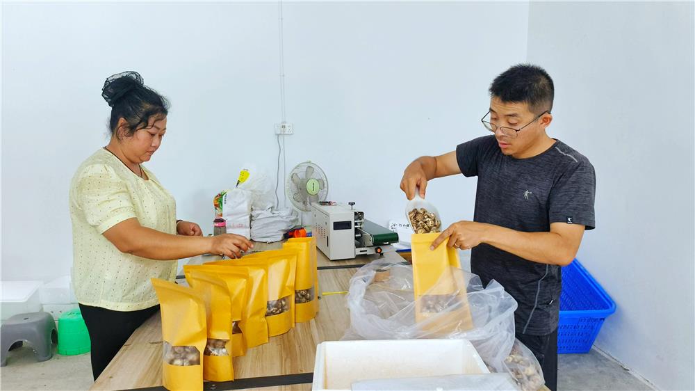 仁贤街道仁贤社区农本味生鲜供应链服务中心,唐俊(右)带领工人对香菇等农特产品进行打包。