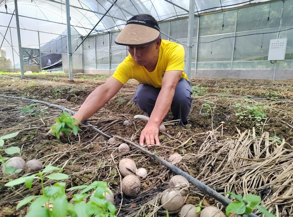 彭水石盘乡香树村综合专干谢岚峰正在查看竹荪菌长势。通讯员 廖唯 摄