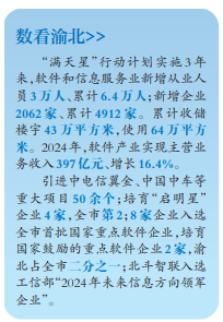 3年来,渝北区软件和信息服务业新增从业人员3万人,累计达6.4万人;新增企业2062家,累计4912家。仙桃数据谷更是成功创建西南地区首个软件信息领域“国家新型工业化产业示范基地”,2024年营收达117亿元,从业人员超2万人。