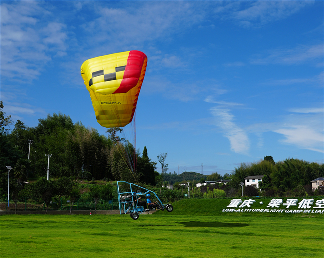 梁平低空飞行营地,游客在乘坐动力滑翔伞。