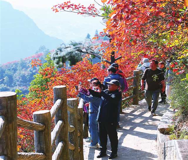 游客在巫峡·神女景区观赏红叶 摄/卢先庆