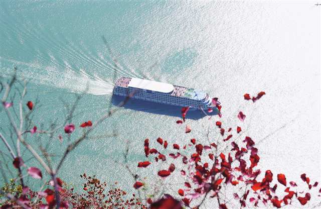 长江游轮穿行于巫山红叶美景之中 摄/卢先庆