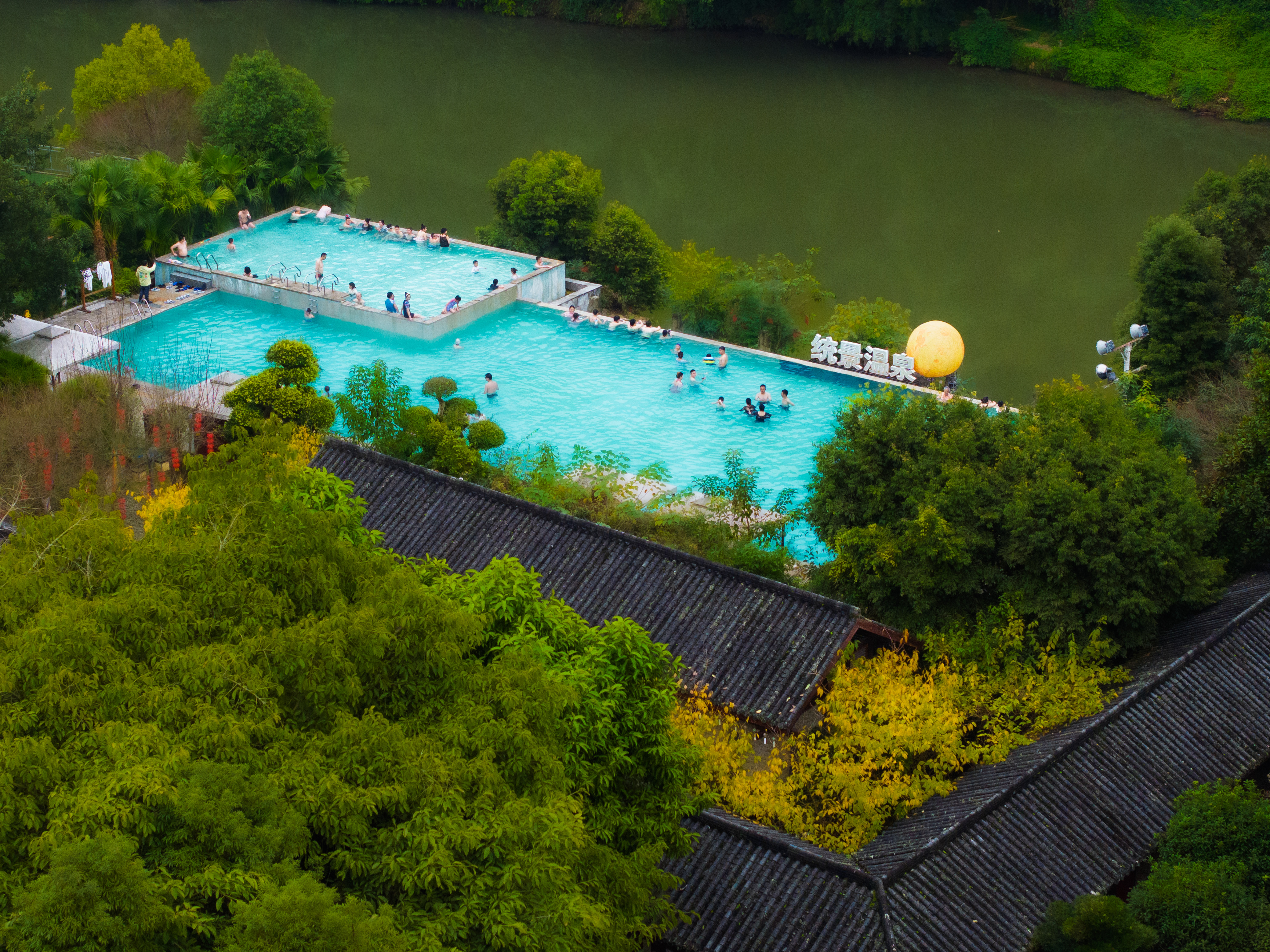 北碚区统景温泉景区,市民和游客正在泡温泉(无人机照片)。(资料图片)记者 李雨恒 摄