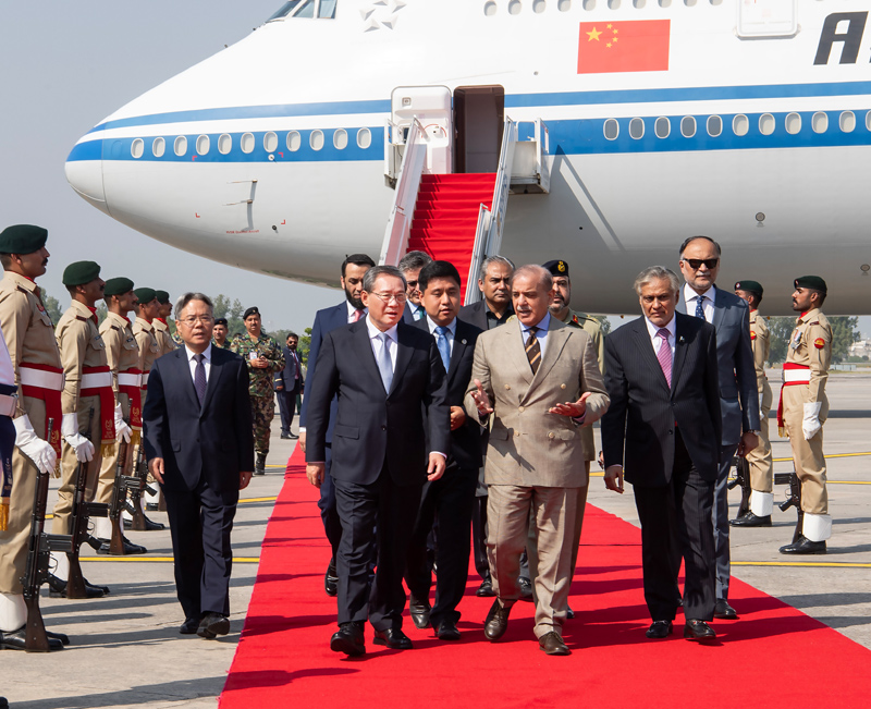 应巴基斯坦总理夏巴兹邀请,国务院总理李强乘包机于当地时间10月14日中午抵达伊斯兰堡努尔·汗机场,开始对巴基斯坦进行正式访问并将出席上海合作组织成员国政府首脑(总理)理事会第二十三次会议。新华社记者 李涛 摄