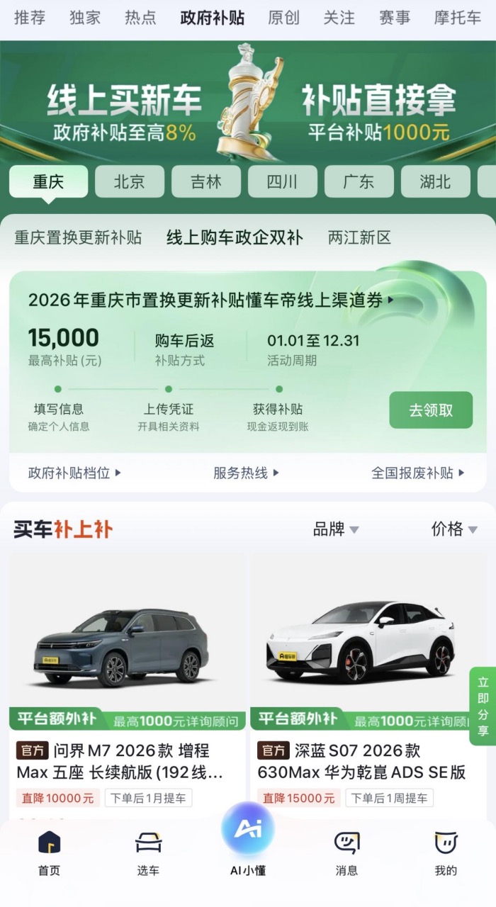 据介绍,消费者可通过懂车帝App“政府补贴”频道申领重庆汽车置换更新补贴。符合条件的消费者,换购新能源车按车价8%给予“国补”补贴,最高1.5万元;换购燃油车按车价6%给予“国补”补贴,最高1.3万元。此外,重庆还推出“政企双补”活动,联动懂车帝为消费者提供最高1000元的平台额外补贴,可与“国补”叠加使用。消费者通过懂车帝线上购买新车可享500元补贴,同时出售旧车可再享500元补贴。也就是说,若消费者通过“线上购车政企双补”频道一站式申领补贴、置换新车,优惠金额最高可达16000元。