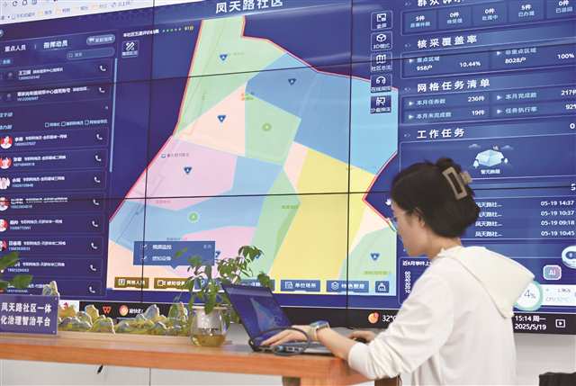覃家岗街道凤天路社区,工作人员在查看“141”基层智治平台