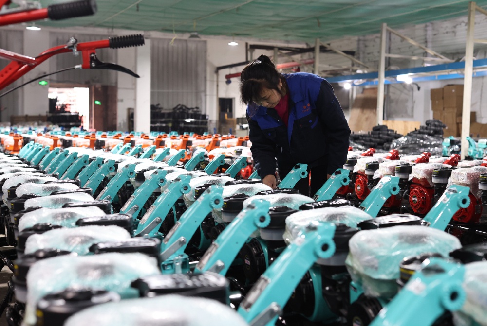 3月9日,位于沙坪坝区回龙坝镇的重庆腾龙盛世机电有限公司,工人正在清点微耕机。特约摄影 孙凯芳