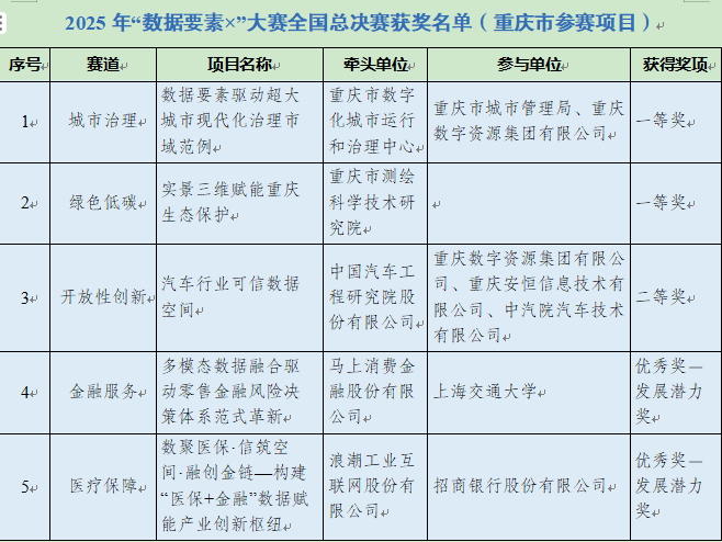 经严格评审,我市参赛团队在本届大赛中取得突破性成绩,共获得全国总决赛一等奖2项、二等奖1项、发展潜力奖2项。其中,“数据要素驱动超大城市现代化治理市域范例”和“实景三维赋能重庆生态保护”两个项目分别荣获城市治理赛道和绿色低碳赛道一等奖,实现双赛道夺冠。与2024年仅获1项一等奖、1项应用实践奖相比,参赛项目获奖数量和质量均大幅提升,充分展现了我市率先开展数字中国建设综合试点取得的显著成效。