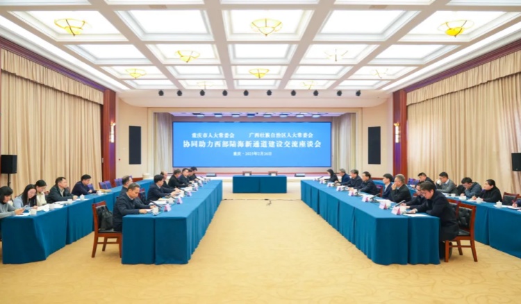 2月26日,重庆市人大常委会和广西壮族自治区人大常委会协同助力西部陆海新通道建设交流座谈会召开。
