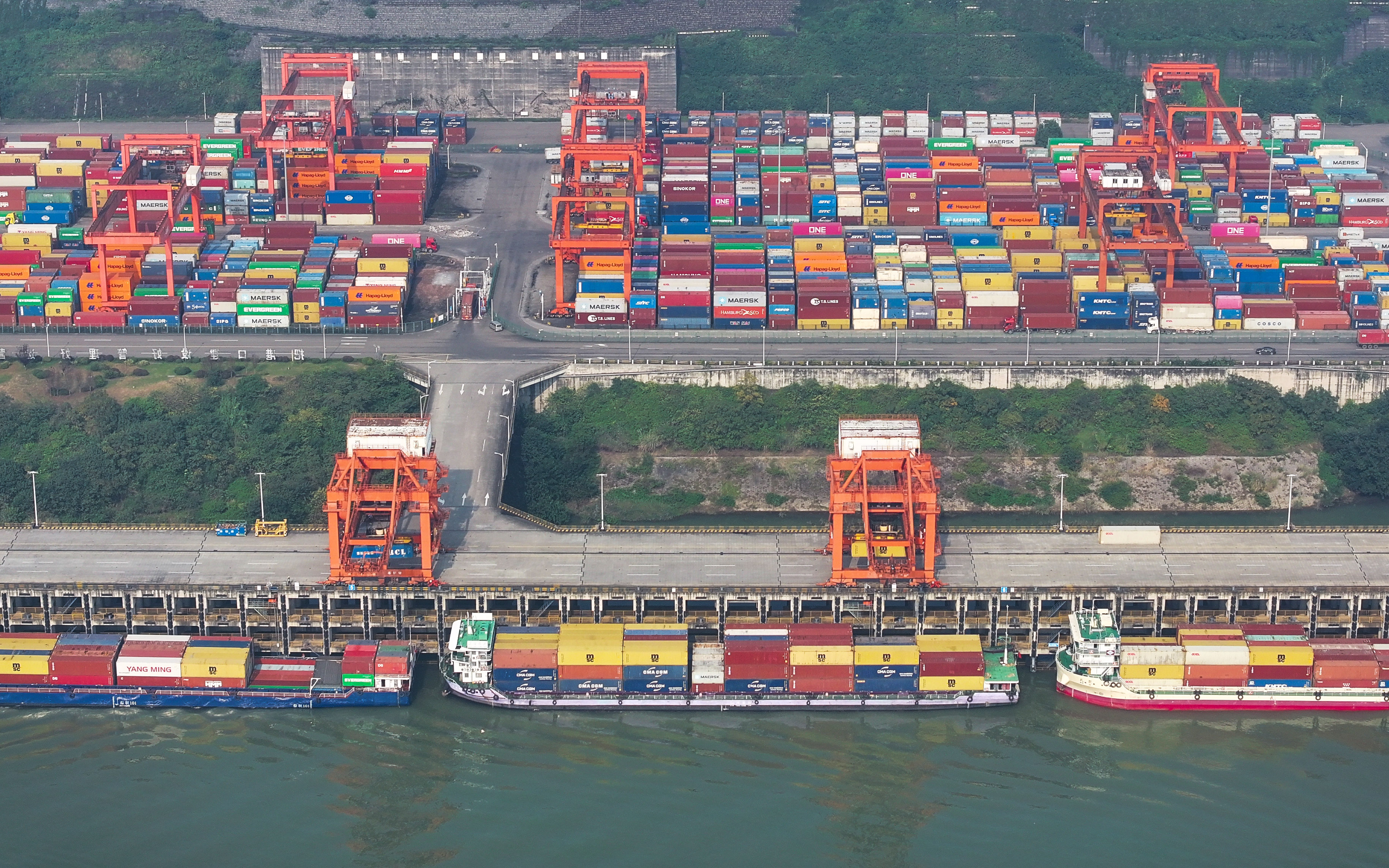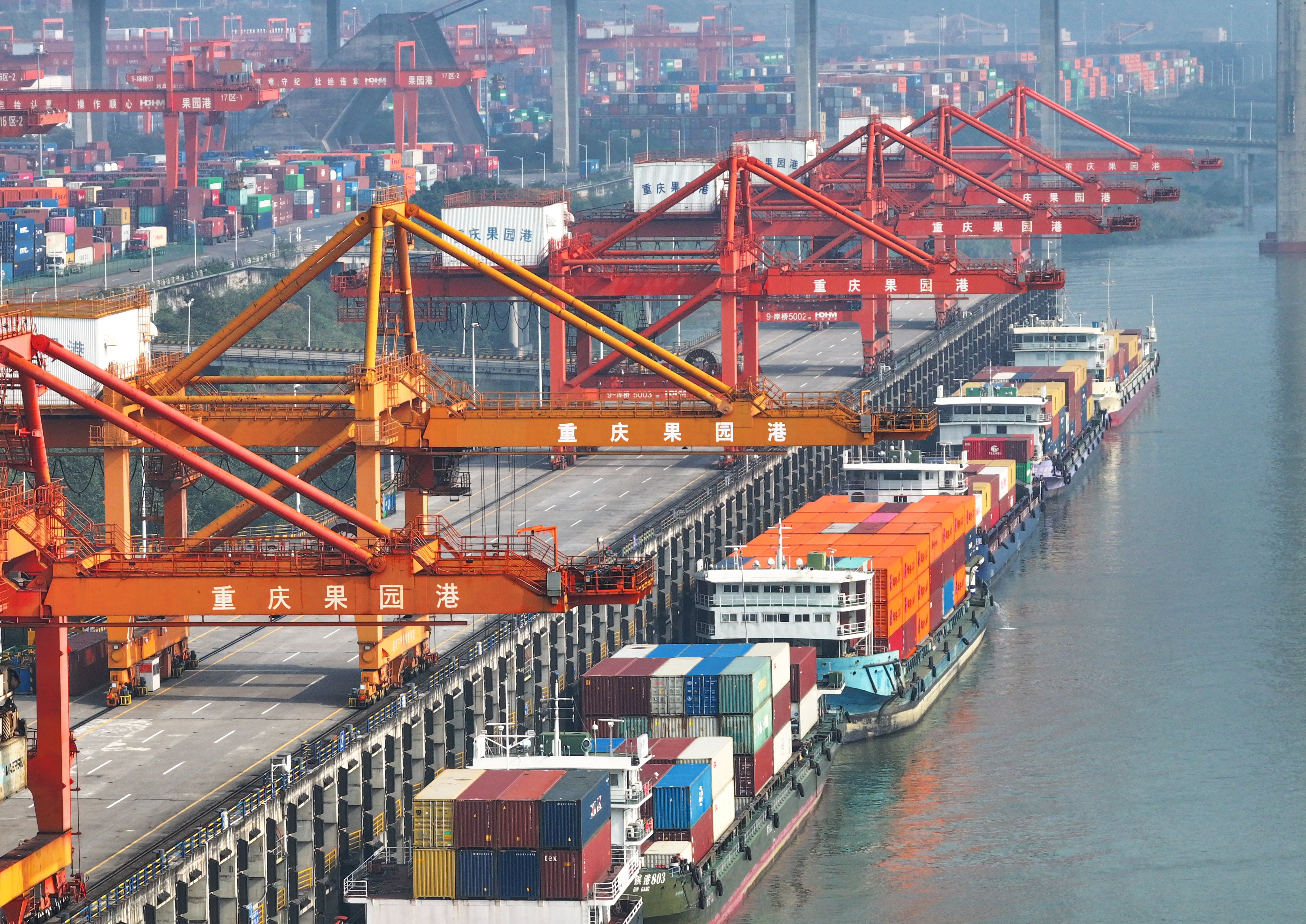 11月24日,重庆果园港,多艘货船停靠在港口装卸集装箱(无人机照片)。首席记者 龙帆 摄