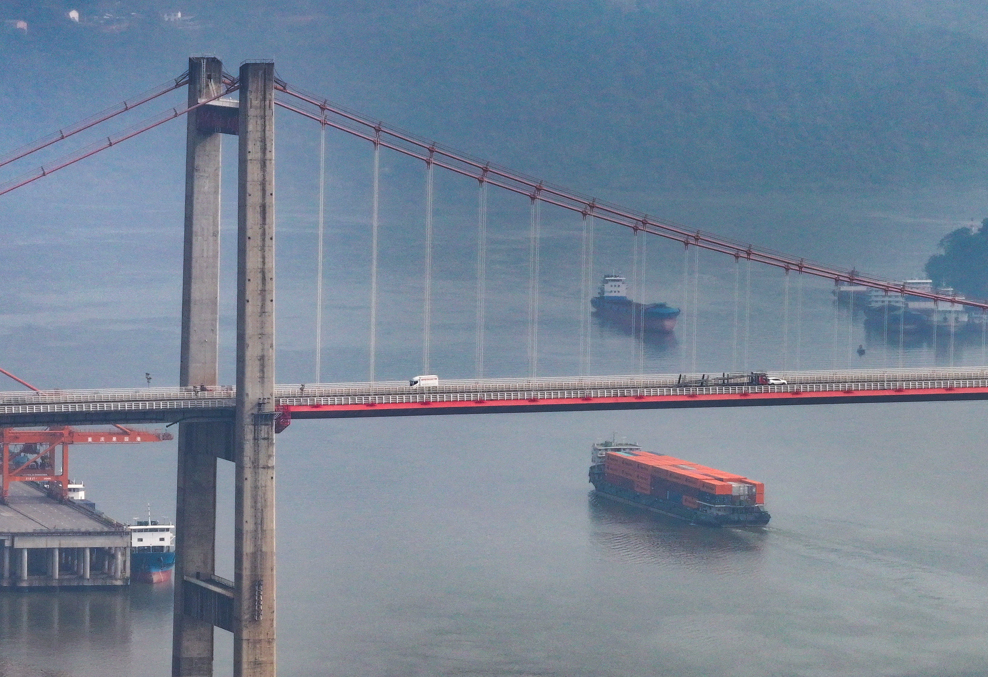 11月24日,重庆果园港,满载集装箱的货船驶出港口(无人机照片)。首席记者 龙帆 摄