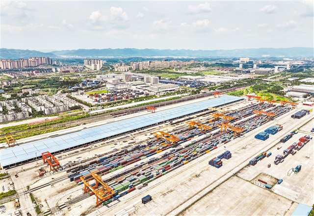 重庆是西部制造重镇,包括现代物流在内的生产性服务业发展潜力巨大。图为9月16日,位于沙坪坝区的团结村中心站龙门吊起降不停,每天至少有四趟西部陆海新通道班列从这里发运。通讯员 郭晋 摄\视觉重庆