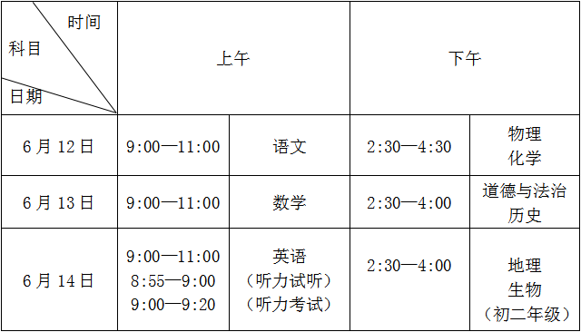 答:采用全市统一命题的考试科目为:语文、数学、英语、物理、化学、道德与法治、历史、地理和生物等九科。物理和化学、道德与法治和历史、地理和生物分别实行合堂分卷。道德与法治和历史实行开卷考试,其余科目为闭卷考试。
