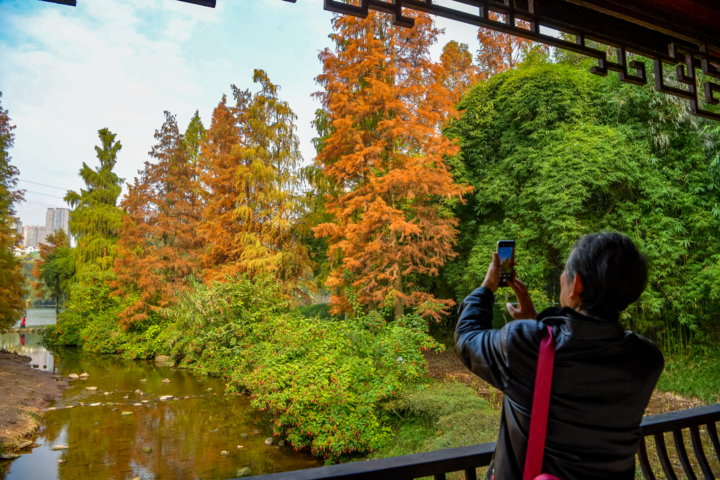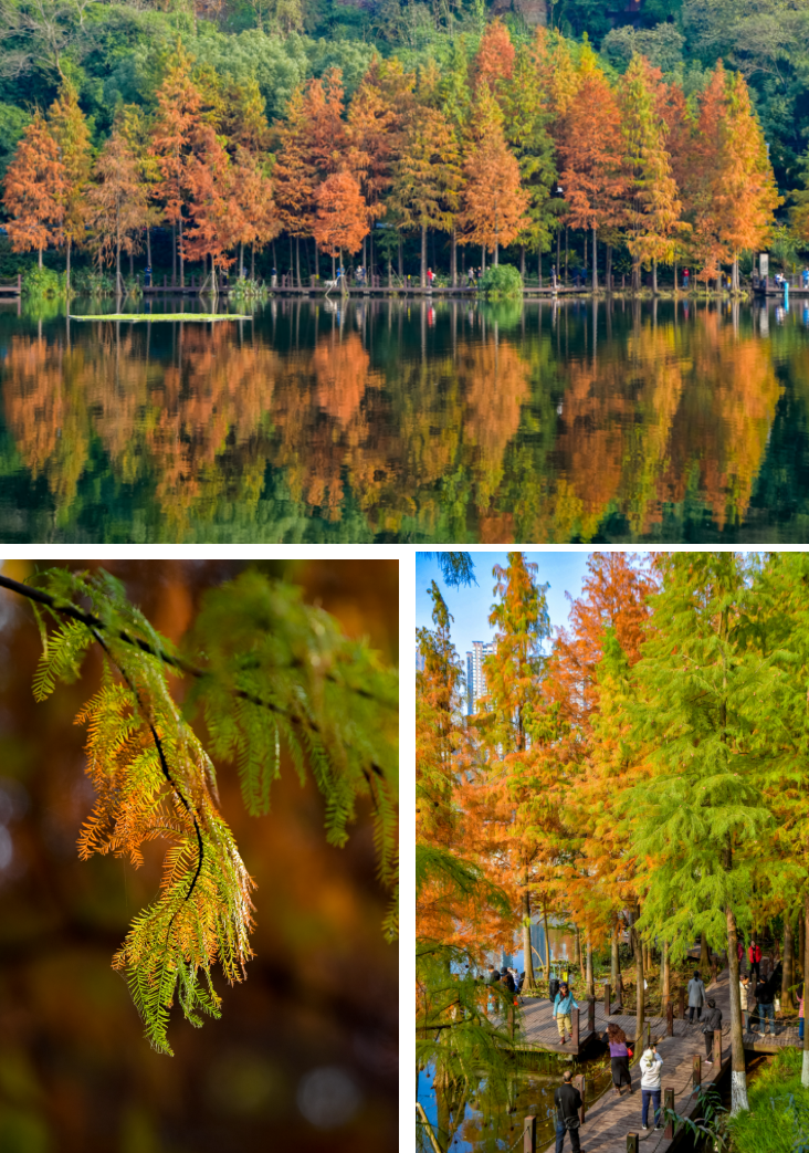 目前,彩云湖国家湿地公园内的350余株水杉已进入最佳观赏期,主要分布在阶梯广场、桃花诗廊、云溪钓鱼等区域,一棵棵挺拔的水杉,兼有常绿树木相衬,别有一番风情。