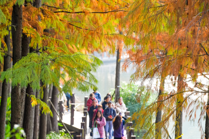 冬日暖阳正好,水杉林的木质栈道上满是赏景的市民,阳光透过高耸的枝丫洒在叶片上,闪闪发光。