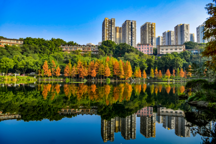 宛若被打翻的调色盘。绿、橙、红、金层层叠叠,与碧绿的湖水相映,绘就一幅层林尽染的立体油画,令漫步其间的游客陶醉不已。