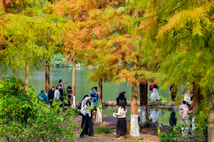 彩林尽染醉,斑斓无尽时。彩云湖国家湿地公园内的水杉逐渐由翠绿变成深红。