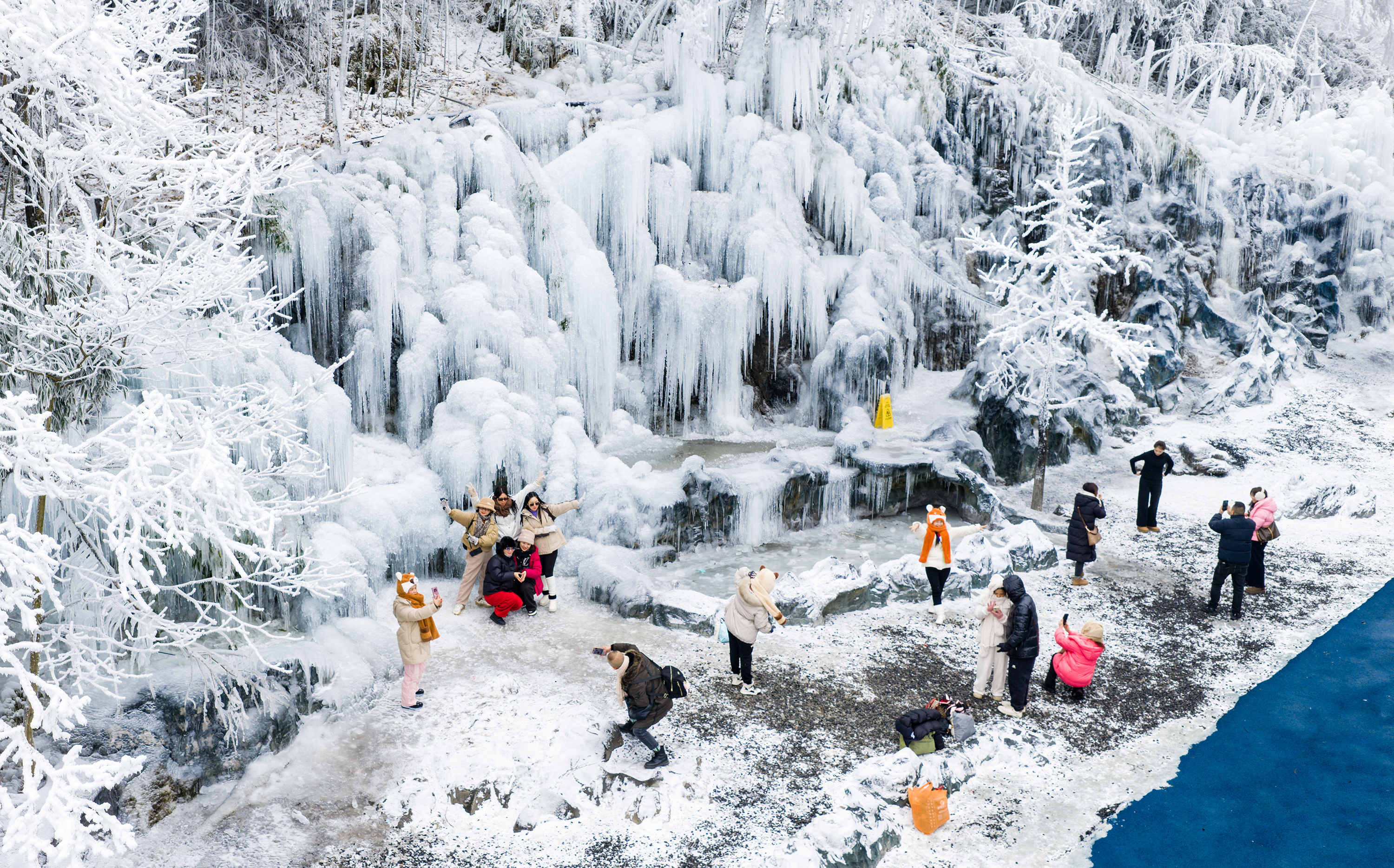 2026年1月5日,南川区金佛山景区观霞台,游客在晶莹剔透的冰瀑下拍照打卡(无人机照片)。通讯员 胡波 摄